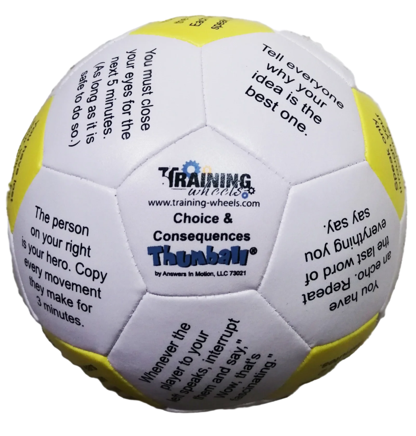 Sometimes the facilitator gets looked at as the ‘bad guy’ for making the group start completely over, when in fact, it was the group's actions or decisions that got them into the situation. The Choice & Consequences Thumball can step in (or get tossed in!) as the bearer of the bad news, the heavy hand, or the rule enforcer. With one toss fate will decide what happens next, and you are no longer the bad guy! By implementing choice into the equation, the group has more ownership in the process and it can really shift the group's attitude. The consequences can sometimes add comic relief at a pivotal point. Sometimes it adds to the challenge but seems to break up the monotony where starting over happens a lot. Pick one up today and give it a try!