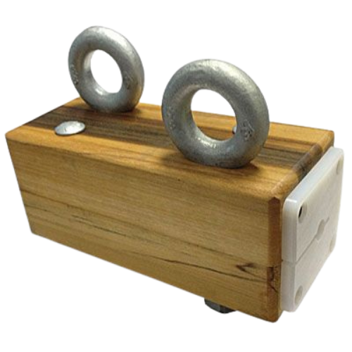 Carved from dense Appalachian hardwood and sealed with an environmentally safe preservative. The striking surface is crafted from ultra-high molecular weight polyethylene, noted for it's exceptional wear resistance. Steel hardware and two galvanized eye bolts round out the package. Mounts around cable and attaches to a static point with a bungee cord (not included).