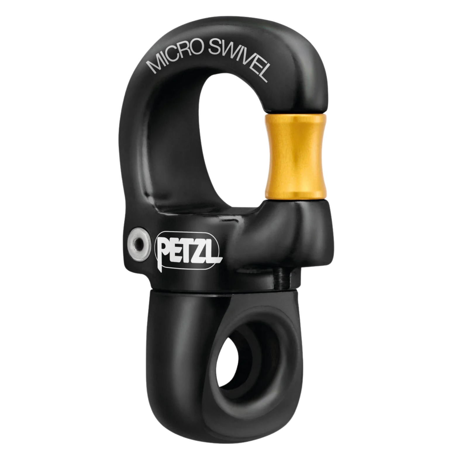 Compact openable swivel designed for attachment to a locking carabiner, to avoid twisting of lanyards and to allow correct positioning of devices. Its design without bearings allows it to turn freely when not loaded and to stop moving when loaded in order to maintain the devices in position.