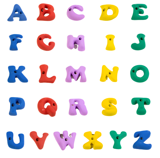 A set of colorful alphabet climbing holds ranging from A to Z, each in a different color.