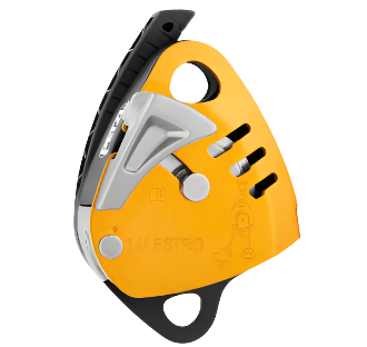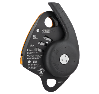 MAESTRO S by Petzl is a descender designed for technical rescue operations. It facilitates manipulation of heavy loads, for lowering or hauling, and may be used in both the primary system or in a back-up belay. This versatility allows rescuers to adapt to any situation they may encounter on the rescue scene. The ergonomic handle and integrated brake allow for comfortably controlled descent. Shifting from lowering position to hauling position is immediate, without the need to transfer the load. The integrated progress-capture pulley has a large diameter sheave mounted on sealed ball bearings, ensuring excellent hauling efficiency. The AUTO-LOCK system automatically locks the rope when the handle is not in use. Once locked, the rope can be taken up without having to manipulate the handle. The MAESTRO S descender is compatible with 10.5 to 11.5 mm ropes and allows handling of loads up to 250 kg.